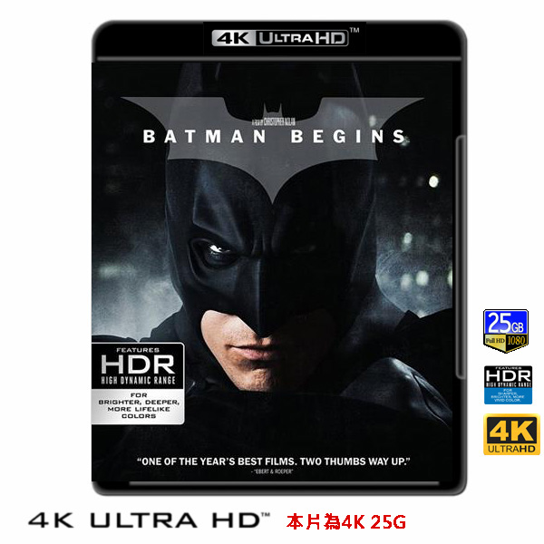 商品屬性 [片名] 蝙蝠俠:開戰時刻 Batman Begins (2005) 4KUHD25G [年份] 2005 [格式] 4KUHD25G [片裝數] 1 [發音] 英DTS-HD MA5.1....等 [字幕] 繁中/簡中/英 [備註] 本片為4KUHD25G,藍光機無法播放,必須用4KUHD25G帶HDR的播放機來放影 本片為4KUHD - 25G本片為4KUHD影片,必須用4KUHD帶HDR播放機才可以播放,一般藍光機(Blu-ray Player, PS3, PS4, PS4 pro,Blu-ray Rom,升級後的Xbox ONE S/X 均無法讀取影片).HDR效果:必須4KUHD播放機配合電視為4K帶HDR及亮度達700NIT以上才可以完美享受HDR效果.市場上很多假4K播放機及平價假4K電視,相關規格不詳,請小心購買.有關4KUHD的問題,請參考>>>>點入參考<<<4KUHD實物包裝如圖:從小親眼目睹父母被殘忍地殺害,布魯斯‧韋恩(克里斯蒂安‧貝爾飾)一生充滿憤怒和復仇的怒火,他為了報仇幾乎不擇手段。雖然韋恩繼承了父母事業,成為億萬富翁,然而童年的陰影從未一刻消逝,他環遊世界、希望報仇和打擊罪惡。年輕的韋恩到了亞洲,卻意外進了監獄。在獄中,他受到忍者集團首領的邀請,加入集團,接受了忍者培訓。然而,不久他就發現忍者集團對自己的故鄉哥譚市別有目的,毅然決定重返故鄉。可他發現這座城市已經成為一座被各式各樣的犯罪集團所圍繞的墮落腐朽的城市,眾多勢力不想讓他繼承父母的韋恩莊園。