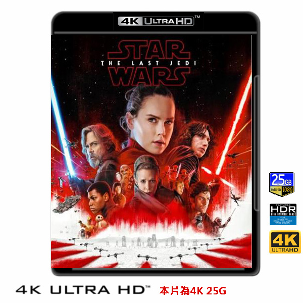 商品屬性 [片名] STAR WARS:最後的絕地武士 Star Wars: The Last Jedi (2017) 4KUHD25G [年份] 2017 [格式] 4KUHD25G [片裝數] 1 [發音] 英DD-Atmos(兼容DD-HD 7.1) [字幕] 繁中/簡中/英 [備註] 本片為4KUHD25G,藍光機無法播放,必須用4KUHD25G帶HDR的播放機來放影 本片為4KUHD - 25G本片為4KUHD影片,必須用4KUHD帶HDR播放機才可以播放,一般藍光機(Blu-ray Player, PS3, PS4, PS4 pro,Blu-ray Rom,升級後的Xbox ONE S/X 均無法讀取影片).HDR效果:必須4KUHD播放機配合電視為4K帶HDR及亮度達700NIT以上才可以完美享受HDR效果.市場上很多假4K播放機及平價假4K電視,相關規格不詳,請小心購買.有關4KUHD的問題,請參考>>>>點入參考<<<4KUHD實物包裝如圖:七部曲演員將持續在八部曲中演出,目前只有R2-D2的演員更換。喬治盧卡斯將參與八部曲的劇本,電影於2016年1月倫敦進行拍攝。卡司有「芬恩」約翰波耶加、「芮」黛西蕾德莉、「凱羅忍」亞當崔佛、「波戴姆倫」奧斯卡伊薩克、「瑪茲卡娜塔」奧斯卡金獎得主露琵塔尼詠歐、「法斯瑪隊長」關朵琳克莉絲蒂和「赫斯將軍」多姆納爾格里森、「路克」馬克漢米爾等。 故事接續在《STAR WARS:原力覺醒》之後,芮找到了路克,將光劍物歸原主,她請求路克與她返回抵抗勢力,幫助抵抗勢力對抗第一軍團,但路克拒絕了,並向芮揭諸他決定讓絕地武士走入末路的真正原因,以及他與凱羅忍之間的關係。同時,抵抗勢力的戰艦遭受第一軍團的追擊,莉亞公主重傷昏迷,指揮權交接給何朵中將;然而何朵中將的撤退決定,似乎讓抵抗勢力陷入更多的危機,波戴姆倫決定秘密行動,讓芬恩與蘿絲實行潛入史諾克戰艦的秘密任務。而芮在得知她有機會挽救凱羅忍從黑暗面返回光明面後,也動身前往史諾克的戰鑑。 原力的平衡、絕地武士的存亡、銀河系的未來…都即將揭曉。