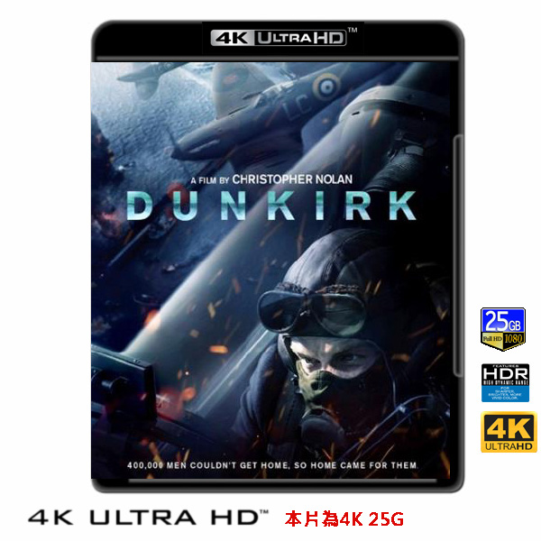 商品屬性 [片名] 敦克爾克大行動 Dunkirk (2017) 4KUHD25G [年份] 2017 [格式] 4KUHD25G [片裝數] 1 [發音] 英DTS-HD MA5.1 [字幕] 繁中/簡中/英 [備註] 本片為4KUHD25G,藍光機無法播放,必須用4KUHD25G帶HDR的播放機來放影 本片為4KUHD - 25G本片為4KUHD影片,必須用4KUHD帶HDR播放機才可以播放,一般藍光機(Blu-ray Player, PS3, PS4, PS4 pro,Blu-ray Rom,升級後的Xbox ONE S/X 均無法讀取影片).HDR效果:必須4KUHD播放機配合電視為4K帶HDR及亮度達700NIT以上才可以完美享受HDR效果.市場上很多假4K播放機及平價假4K電視,相關規格不詳,請小心購買.有關4KUHD的問題,請參考>>>>點入參考<<<4KUHD實物包裝如圖:《黑暗騎士》、《星際效應》克里斯多福諾蘭最新作品,這是他首次執導二次世界大戰的題材,《瘋狂麥斯:憤怒道》湯姆哈迪、《間諜橋》馬克勞倫斯、英國莎劇才子肯尼斯布萊納、英國男子團體「一世代」哈利史泰爾斯主演。 《敦克爾克大行動》以二次世界大戰為故事背景,當數十萬名英軍與盟軍被敵人的武力團團包圍,他們的背後只有冰冷的大海,而敵軍正從四方進逼,隨時可以一舉殲滅盟軍。敵軍利用大規模空襲的方式攻擊海灘上無處可躲、彈盡援絕的盟軍。為此,英國下令出動各式大小船隻,冒著猛烈的戰火,出發拯救盟軍。 這是改變二次大戰結果的關鍵行動,也是塑造現今世界的決定性事件之一,希望是他們唯一的武器,存活就是勝利。 二次世界大戰的一次軍事撤退行動,1940年5月25日,英法聯軍在德國軍隊凌厲攻勢下潰不成軍,英軍在敦克爾克這個位於法國東北部靠近比利時港口城市進行的史上最大規模的軍事撤退行動。
