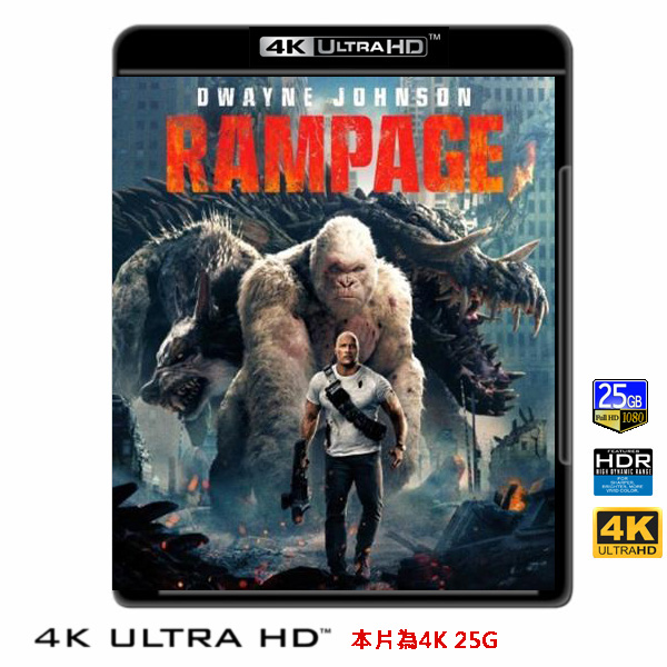 商品屬性 [片名] 毀滅大作戰 Rampage (2018) 4KUHD25G [年份] 2018 [格式] 4KUHD25G [片裝數] 1 [發音] 英 [字幕] 繁中/簡中/英 [備註] 本片為4KUHD25G,藍光機無法播放,必須用4KUHD25G帶HDR的播放機來放影 本片為4KUHD - 25G本片為4KUHD影片,必須用4KUHD帶HDR播放機才可以播放,一般藍光機(Blu-ray Player, PS3, PS4, PS4 pro,Blu-ray Rom,升級後的Xbox ONE S/X 均無法讀取影片).HDR效果:必須4KUHD播放機配合電視為4K帶HDR及亮度達700NIT以上才可以完美享受HDR效果.市場上很多假4K播放機及平價假4K電視,相關規格不詳,請小心購買.有關4KUHD的問題,請參考>>>>點入參考<<<4KUHD實物包裝如圖:電影由布萊德派頓(Brad Peyton)執導,巨石強森、娜歐蜜哈瑞絲主演。 劇情改編自美國1980年推出的知名電視遊戲《怪獸大破壞》,這個遊戲製作簡單但深受當代玩家喜愛。三個普通人被一起實驗事故轉變成三隻怪獸,他們要展開逃亡、躲避軍隊追擊並定時補充能量,防止再次變回人類型態。 在電影中,巨石強森此次飾演一位英勇的靈長類動物學家,最好的朋友是一隻叫做喬治(George)的白化症銀背猩猩,但當一個實驗血清出錯時,喬治與其他生物都變得超級巨大,於是他與娜歐蜜哈瑞絲飾演的基因科學家緊跟著蹤跡踏上這個困難的旅程。 電影劇情敘述靈長類動物學家戴維斯奧克耶(巨石強森 飾),他天性孤僻,不善與人交際,但是卻與一頭智商極高、個性溫馴的銀背大猩猩「喬治」整天形影不離。 喬治從兩歲起就一直接受戴維斯的照顧,卻沒想到一次基因實驗出狀況,讓喬治在一夜之間產生無法預測的突變,成為一頭力大無窮且身手矯健的巨大猛獸,所到之處破壞殆盡。然而禍不單行的是,其他地方也很快發現類似的大型變種生物,像是飛狼與鱷魚…等,牠們在北美各地到處肆虐。於是戴維斯與基因工程師凱特(娜歐蜜哈瑞絲)攜手合作,要設法盡快找到解藥,藉以終止這場毀滅性的大災難,同時拯救那位曾經是他朋友的「喬治」。