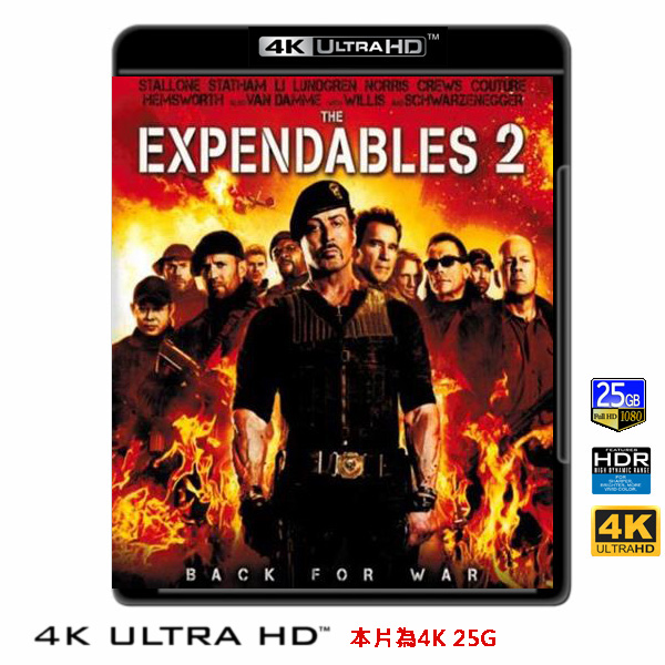 商品屬性 [片名] 浴血任務2 The Expendables 2 (2012) 4KUHD25G [年份] 2012 [格式] 4KUHD25G [片裝數] 1 [發音] 英DD-Atmos(兼容DD-HD 7.1)..等多條 [字幕] 繁中/簡中/英 [備註] 本片為4KUHD25G,藍光機無法播放,必須用4KUHD25G帶HDR的播放機來放影 本片為4KUHD - 25G本片為4KUHD影片,必須用4KUHD帶HDR播放機才可以播放,一般藍光機(Blu-ray Player, PS3, PS4, PS4 pro,Blu-ray Rom,升級後的Xbox ONE S/X 均無法讀取影片).HDR效果:必須4KUHD播放機配合電視為4K帶HDR及亮度達700NIT以上才可以完美享受HDR效果.市場上很多假4K播放機及平價假4K電視,相關規格不詳,請小心購買.有關4KUHD的問題,請參考>>>>點入參考<<<4KUHD實物包裝如圖:繼《浴血任務》全球狂賣2.7億美元,席維斯史特龍再度力邀動作巨星群共襄盛舉,這次史特龍卸下導演身份,將導演筒交給《空中監獄》導演賽門魏斯特執導。 驍勇善戰的傭兵團長巴尼羅斯再次接獲CIA幹員教堂先生的委託,率領聖誕、陰陽等沙場老將,加上比利、瑪姬兩位新成員聯手出擊,受命解救一名香港的科學家。 然而,看似簡單的任務竟出現致命錯誤,他們不但慘敗更痛失夥伴。悲傷與怒火的情緒交雜,在新成員的幫助下,這群敢死英雄將以終極手段,毀滅握有核武的恐怖份子,替死去的弟兄復仇… 除了上一集的堅強陣容,本集中《終極警探》布魯斯威利與《魔鬼終結者》阿諾史瓦辛格再度拾起槍桿子來幹爆敵人。李連杰本來不打算接演續集,但席維斯史特龍展現冀盼他續留的誠意,專程到香港取景,終於讓李連杰點頭。好萊塢新星連恩漢斯沃、動作巨星尚克勞范達美也加入戰局。 。
