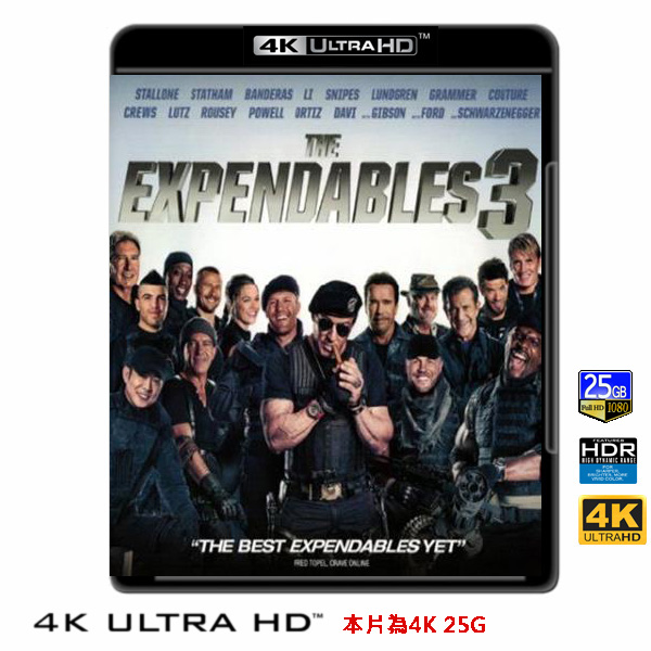 商品屬性 [片名] 浴血任務3 The Expendables 3 (2014) 4KUHD25G [年份] 2014 [格式] 4KUHD25G [片裝數] 1 [發音] 英DD-Atmos(兼容DD-HD 7.1)..等多條 [字幕] 繁中/簡中/英 [備註] 本片為4KUHD25G,藍光機無法播放,必須用4KUHD25G帶HDR的播放機來放影 本片為4KUHD - 25G本片為4KUHD影片,必須用4KUHD帶HDR播放機才可以播放,一般藍光機(Blu-ray Player, PS3, PS4, PS4 pro,Blu-ray Rom,升級後的Xbox ONE S/X 均無法讀取影片).HDR效果:必須4KUHD播放機配合電視為4K帶HDR及亮度達700NIT以上才可以完美享受HDR效果.市場上很多假4K播放機及平價假4K電視,相關規格不詳,請小心購買.有關4KUHD的問題,請參考>>>>點入參考<<<4KUHD實物包裝如圖:《浴血任務》系列前2集熱賣171億元台幣,因此原班人馬這次推出續集,並加入新的老牌硬漢主演。這次演員陣容包括了阿諾史瓦辛格、席維斯史塔龍、安東尼歐班德拉斯、梅爾吉勃遜、拳王維克多奧提茲以及李連杰等將一同演出。 巴尼(席維斯史特龍飾)、聖誕(傑森史塔森飾)和陰陽(李連杰 飾)等人這回對上了「浴血幫」的另一元老康拉德史東班克斯(梅爾吉勃遜 飾)。多年前走入歧途的康拉德成為心狠手辣的軍火販子,也因而成為巴尼受命剷除的頭號目標,但巴尼萬萬沒想到的是,並沒有被他刺殺成功的康拉德捲土重來,並誓死殲滅浴血幫。 面對這個昔日夢魘並空前強大的惡勢力,一向出奇制勝的巴尼招募一批年輕力盛並具有高科技能力的「浴血新兵」,一場新舊對決的史上最強「浴血大戰」就此展開。 首度加入演出的安東尼奧班德拉斯親力親為,除了從大樓往直昇機上跳之外,一連串的爆破等精彩動作與特技都親自上陣。而在一票硬漢巨星中,《浴血任務3》還找來曾代表美國拿下北京奧運銅牌的格鬥美女龍達魯西,將在片中有精彩的拳腳演出。