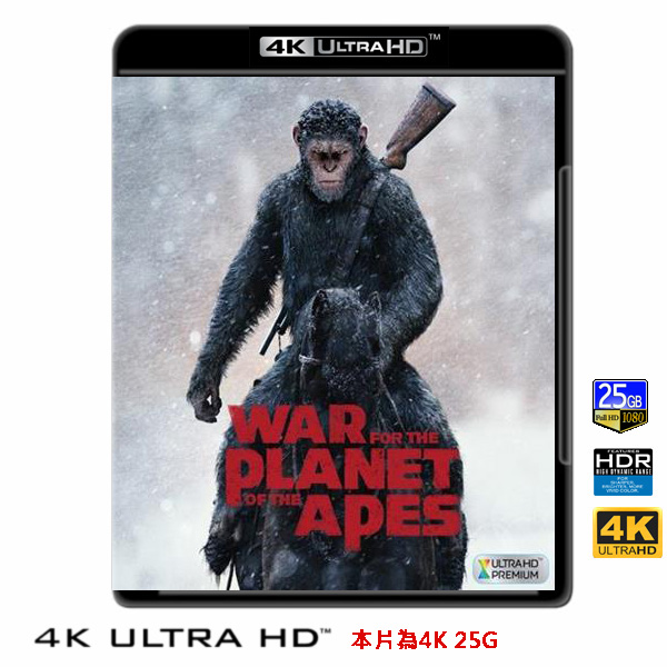 商品屬性 [片名] 猩球崛起:終極決戰 War For The Planet Of The Apes (2017) 4KUHD25G [年份] 2014 [格式] 4KUHD25G [片裝數] 1 [發音] 英DD-Atmos(兼容DD-HD 7.1)..等多條 [字幕] 繁中/簡中/英 [備註] 本片為4KUHD25G,藍光機無法播放,必須用4KUHD25G帶HDR的播放機來放影 本片為4KUHD - 25G本片為4KUHD影片,必須用4KUHD帶HDR播放機才可以播放,一般藍光機(Blu-ray Player, PS3, PS4, PS4 pro,Blu-ray Rom,升級後的Xbox ONE S/X 均無法讀取影片).HDR效果:必須4KUHD播放機配合電視為4K帶HDR及亮度達700NIT以上才可以完美享受HDR效果.市場上很多假4K播放機及平價假4K電視,相關規格不詳,請小心購買.有關4KUHD的問題,請參考>>>>點入參考<<<4KUHD實物包裝如圖:《猩球崛起》前傳系列狂掃全球逾380億票房,第三部曲再創系列顛峰。《猩球崛起:黎明的進擊》麥特李維斯執導,茱蒂葛瑞兒、伍迪哈里遜主演。世界大師級動態捕捉演員,安迪席克斯再度回歸。 人類及猩猩史詩般終極決戰,誰才是最後主宰世界的物種?全球超賣座重量級鉅作系列《猩球崛起》第三部曲《猩球崛起:終極決戰》隨著上一篇章的故事延續,在人類與猩猩間的緊繃局勢之下,兩派主宰世界的族群對峙情況逐漸加劇。 十五年前的一場科學實驗出了錯,一群擁有高度智慧的猩猩就此崛起,而人類因為一種稱之為「猩流感」病毒近乎瀕臨絕種。正當人類因深陷流感而陷入即將滅亡的困境時,猩猩們則持續在舊金山北邊的森林裡安全地發展——但對於那些少數因對病毒免疫而僥倖存活下來的人類來說,或許死亡才是一種祝福。 在文明逐漸茁壯的黎明之際,猩猩在沒有人類接觸的環境中蓬勃發展,直到他們發現一群倖存的人類亟欲在此建立他們的新聚落。他們將這批人類視為入侵者,而入侵者與猩猩的共存是一場掙扎,搖搖欲墜的和平在柯巴報復前飼主的行動下,就此粉碎。猩猩們的領袖凱撒試圖重整秩序,但逐漸蔓延的野蠻戰役已無退路。 處境艱困的入侵者瘋狂地尋求協助,但事實上他們內心根本不確定是否仍有人類存活在這世上,能夠回應他們的困境。北方八百英里處的路易斯麥科德聯合基地收到了他們的訊號,數百名軍人在遭受病毒的末日攻擊後在此避難,他們是由特種部隊上校領導僅存的美國國軍,而這強悍兇猛的一師回應了他們的請求,就此加入戰局。戰爭爆發之後,凱撒和猩猩族人們一同撤退回了森林,然而人類卻不斷逼迫,決心要一舉消滅猩猩。兩年來,傳奇地凱撒在森林深處基地指揮著猩猩一族的傳言從未停止,然而軍隊卻持續尋找凱撒未果。 這場終極決戰就此展開… 凱撒所領導的猩猩族群,面對著一位冷血殘暴並率領著人類武裝軍團的軍官強烈逼迫,為了生存,牠們不得不展開致命反擊,然而,長期激烈對抗的消磨不僅讓猿類一族元氣大傷,連帶導致族類情勢急轉直下,也迫使凱撒與自己內心的黑暗本能不斷角力,並且引發牠密謀報復的想法。旅程最終兩方人馬再度對峙,凱撒及軍官都發動所有軍力全面迎戰,而這場史詩般的終極決戰將牽絆著兩方物種及這座星球的未來命運。