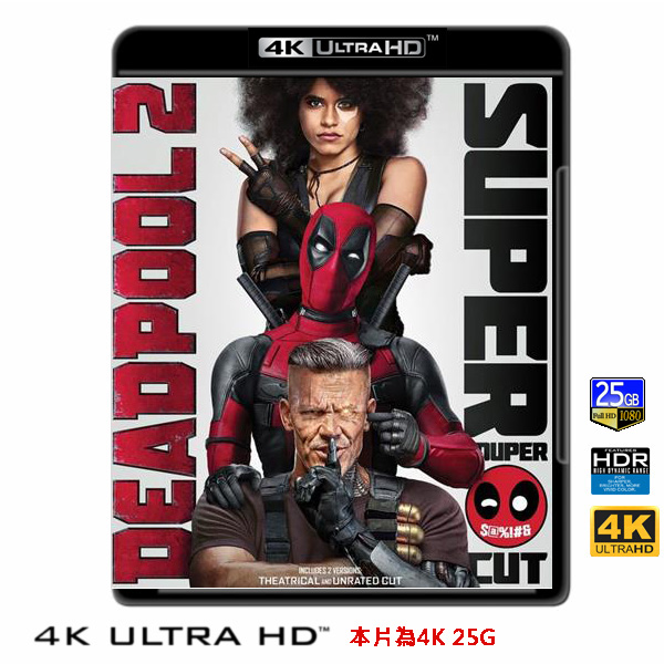 商品屬性 [片名] 死侍2 Deadpool 2 (2017) 4KUHD25G [年份] 2017 [格式] 4KUHD25G50G [片裝數] 1 [發音] 英DD-Atmos(兼容DD-HD 7.1)...等 [字幕] 繁中/簡中/英 [備註] 本片為4KUHD25G,藍光機無法播放,必須用4KUHD25G帶HDR的播放機來放影 本片為4KUHD - 25G本片為4KUHD影片,必須用4KUHD帶HDR播放機才可以播放,一般藍光機(Blu-ray Player, PS3, PS4, PS4 pro,Blu-ray Rom,升級後的Xbox ONE S/X 均無法讀取影片).HDR效果:必須4KUHD播放機配合電視為4K帶HDR及亮度達700NIT以上才可以完美享受HDR效果.市場上很多假4K播放機及平價假4K電視,相關規格不詳,請小心購買.有關4KUHD的問題,請參考>>>>點入參考<<<4KUHD實物包裝如圖:哈里森‧福特依舊飾演美國中情局乾員傑克‧雷恩,這一次他捲入了哥倫比亞的販毒戰爭之中,因為美國總統的友人遭毒販謀殺,雷恩奉命追查真相。但另一方面總統又派了秘密的突擊小組對付毒販集團,使雷恩在狀況不明、敵友不分的情況下陷入重重危機。原先上集導演提姆米勒將繼續執導,萊恩雷諾斯也會回鍋繼續飾演另類漫威超級英雄,但在2017年傳出波折,因萊恩雷諾斯也身兼製片,影響力不下提姆米勒,在兩人創意各有堅持,導演提姆米勒決定尊重退出執導與續集工作團隊。在提姆米勒退出一週後也確認由《捍衛任務》雙導演之一的大衛雷奇接下導演棒。 英文官方簡介對續集劇情描述(惡搞):在遭到幾乎接近頻死的牛擊後,容貌全毀的餐廳主廚韋德威爾遜掙紮著實現他的夢想,成為芒特艾裡城最火辣的酒保,為此他也必須學著去調適他已喪失的味覺。韋德威爾遜重新找尋生活中的刺激,就像找到電影《回到未來》中時光車最重要的零件(flux capacitor)。韋德威爾遜必須與忍者、極道和一大群經歷發情期的兇狗對戰,當他旅行走往全世界時,將發現親情、友誼和他的味覺──找到冒險的新意和得到寫在馬克杯上「世界最佳情人」的稱號。 中文官方簡介對續集劇情描述:當一個穿著紅色緊身衣的賤嘴超級英雄,遇上一個帶著刺殺任務的超級戰士時,他們之間的戰火一觸即發;而死侍也被迫要開始思考友情、家人以及身為一個超級英雄背後真正的意義——當然,在進行這些深度思考的同時,他也絕對不會忘了要好好地大踹「五十道屁股的陰影」。畢竟,你也知道,這些幹大事的人,在替自己行善積德做這些好事的同時,也總是不免俗地要使出一些骯髒的小手段嘛,你說是不是~啾咪!