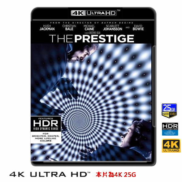 商品屬性 [片名] 頂尖對決 The Prestige (2006) 4KUHD25G [年份] 2006 [格式] 4KUHD25G50G [片裝數] 1 [發音] 英DTS-HD MA5.1...等 [字幕] 繁中/簡中/英 [備註] 本片為4KUHD25G,藍光機無法播放,必須用4KUHD25G帶HDR的播放機來放影 本片為4KUHD - 25G本片為4KUHD影片,必須用4KUHD帶HDR播放機才可以播放,一般藍光機(Blu-ray Player, PS3, PS4, PS4 pro,Blu-ray Rom,升級後的Xbox ONE S/X 均無法讀取影片).HDR效果:必須4KUHD播放機配合電視為4K帶HDR及亮度達700NIT以上才可以完美享受HDR效果.市場上很多假4K播放機及平價假4K電視,相關規格不詳,請小心購買.有關4KUHD的問題,請參考>>>>點入參考<<<4KUHD實物包裝如圖:本片可以說是導演演員的黃金組合。由《蝙蝠俠:開戰時刻》導演克里斯多福諾藍執導,休傑克曼、克里斯丁貝爾、米高肯恩、史嘉蕾喬韓森等明星主演。 本片講述兩個魔法師一生鬥爭的故事,過程充滿詭秘、懸疑、與超現實色彩。休傑克曼、克里斯丁貝爾同是魔法天才,但兩雄雙鬥,最後由朋友變成敵人,且更在魔法比拚中,引出一個神秘莫測的故事。 兩個敵對魔術師的精採生平,兩人因極度對立而展開長達一生的對決,狂熱、欺騙與忌妒讓雙方企圖凌駕另一方,彼此皆不惜身陷危險與致命的後果。從他們當年還是魔術師新秀時首度相遇,勞勃安吉爾(休傑克曼飾)與艾佛瑞波登(克里斯汀貝爾飾)就成為勁敵,他們的友情競爭逐步轉變成敵意對立,不僅彼此成為生活中的凶狠敵手,更讓他們週遭親友也陷入致命危機.. 這是充滿智慧的一段冒險,也是社會至今依然能感受到的巨大轉變。懸疑驚悚片《頂尖對決》編導克里斯多夫諾蘭表示說:「第二次工業革命,是人類發展史上最不尋常、最令人興奮的時代;電力的發明,電影與照相的發明,人類開始以各種公開方式環遊世界,各種理論演進的發展等。」。他認為科學理念在各個領域開始抬頭,各種想法都像徵著摩登進步,這些事物就像現代一樣有趣,這部電影完全不像以過去歷史為背景。 十九世紀後半,科學與宗教開始爭奪起支配地位,人類也發現了生命的重要突破,在這不可思議的新時代中,表演假象、誤導、戲法等魔術就像一場華麗的表演秀,導演諾蘭說:「那時代的魔術顯現出一種"傳統娛樂(魔術是最古老的娛樂表演之一)面臨現代科技誕生所衍生的衝擊的迷人張力。」。 由《記憶拼圖》的編劇強納森諾蘭與克李斯多夫諾蘭攜手改編克李斯多夫培斯特名作小說,製片包括克李斯多夫諾蘭、艾瑪湯瑪斯、亞隆萊德,執行製作包括查爾斯JD史利賽、克里斯J波、威廉泰瑞爾、維勒利狄恩﹔幕後創意團隊靈魂人物則有攝影指導瓦利菲斯特、場景設計指導納森克洛利、剪輯師李史密斯、服裝設計師瓊安柏利。
