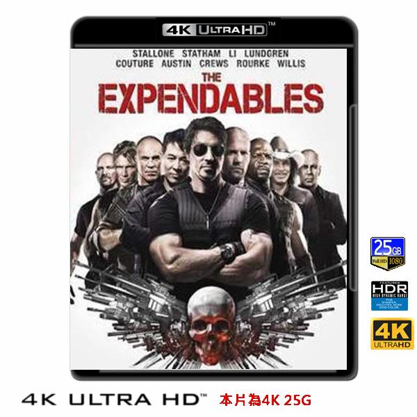 商品屬性 [片名] 浴血任務1 The Expendables 1 (2010) 4KUHD25G [年份] 2010 [格式] 4KUHD25G50G [片裝數] 1 [發音] 英7.1ATOMS...等 [字幕] 繁中/簡中/英 [備註] 本片為4KUHD25G,藍光機無法播放,必須用4KUHD25G帶HDR的播放機來放影 本片為4KUHD - 25G本片為4KUHD影片,必須用4KUHD帶HDR播放機才可以播放,一般藍光機(Blu-ray Player, PS3, PS4, PS4 pro,Blu-ray Rom,升級後的Xbox ONE S/X 均無法讀取影片).HDR效果:必須4KUHD播放機配合電視為4K帶HDR及亮度達700NIT以上才可以完美享受HDR效果.市場上很多假4K播放機及平價假4K電視,相關規格不詳,請小心購買.有關4KUHD的問題,請參考>>>>點入參考<<<4KUHD實物包裝如圖:影片講述了美國政府想僱人深入南美某國推翻當地的獨裁統治,但是卻沒人敢接受這樣的任務,最終這個任務落到史泰龍率領的一支特別行動小組身上。史泰龍飾演的頭領巴尼‧羅斯是個沒什麼可以失去的男人,他深謀遠慮卻又憤世嫉俗,他唯一信任的夥伴就是他那輛破舊的卡車、水上飛機和他忠誠的小隊。他的隊員Lee Christmas(傑森‧斯坦森 飾)是名SAS成員;Bao Thao(李連杰 飾)是個近身搏鬥高手;Hale Caesar (泰瑞‧克魯斯 飾)這個和巴尼‧羅斯相熟10年傢伙是個遠距離武器專家;Toll Road (蘭迪‧庫卓 飾)精通爆炸,並且是團隊的智囊團;最後是Gunnar Jensen(杜夫‧朗格 飾)一個精通狙擊的老兵,但卻需要時時刻刻與自己的心魔作鬥爭。 在當地的聯繫人——美女Sandra (吉瑟勒爾‧伊迪斯 飾)的幫助下,任務逐漸深入,而小隊也明白了他們真正的敵人卻是前CIA警探James Monroe (埃裡克‧羅伯茨 飾)……