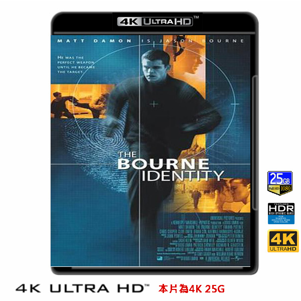 商品屬性 [片名] 神鬼認證1 The Bourne Identity (2002) 4KUHD25G [年份] 2002 [格式] 4KUHD25G50G [片裝數] 1 [發音] 英...等 [字幕] 繁中/簡中/英 [備註] 本片為4KUHD25G,藍光機無法播放,必須用4KUHD25G帶HDR的播放機來放影 本片為4KUHD - 25G本片為4KUHD影片,必須用4KUHD帶HDR播放機才可以播放,一般藍光機(Blu-ray Player, PS3, PS4, PS4 pro,Blu-ray Rom,升級後的Xbox ONE S/X 均無法讀取影片).HDR效果:必須4KUHD播放機配合電視為4K帶HDR及亮度達700NIT以上才可以完美享受HDR效果.市場上很多假4K播放機及平價假4K電視,相關規格不詳,請小心購買.有關4KUHD的問題,請參考>>>>點入參考<<<4KUHD實物包裝如圖:本片改編自小說家勞勃勒德倫1980年的間諜小說,故事內容敘述麥特戴蒙飾演一名失憶症患者,因中槍受傷漂流在大海被漁船救起,發現臀部被植入一枚晶片,晶片上有一個瑞士銀行帳號。他完全不知道自己的身份,但卻擁有一身高強的武藝並精通多國語言。為了找到自己的身份,於是遊遍歐洲各國踏上冒險旅程。他在瑞士銀行帳號的保險箱內發現各國的護照、一筆鉅款、一把自動手槍以及一個名字-傑森包恩-還有一個巴黎的住址。就在包恩想解開這些謎團時發現雖然他誰也不認識,卻不斷遭到許多人的追殺..... 他在逃避追捕時遇到一名德籍女孩瑪莉柯盧茲(法蘭卡波坦飾演),包恩在情急之下以一萬美元為交換條件,要瑪莉開車從瑞士載他到巴黎。瑪莉在金錢的誘惑下和包恩開始了一趟危險之旅。包恩原以為神不知鬼不覺的逃亡行動卻仍然留下線索,他出現的消息也從歐洲傳回美國中情局總部,原來包恩是一名頂尖中情局幹員,負責執行一項被稱為「絆腳石」的暗殺行動,當包恩在暗殺行動失敗後卻死裡逃生,他的上司為保密而決定將他滅口,於是包恩必須憑著他過人的本領躲避追殺,並保護瑪莉的安全。