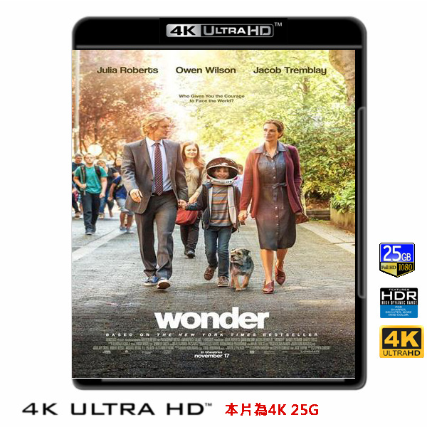 商品屬性 [片名] 奇蹟男孩 Wonder (2017) 4KUHD25G [年份] 2017 [格式] 4KUHD25G50G [片裝數] 1 [發音] 英...等 [字幕] 繁中/簡中/英 [備註] 本片為4KUHD25G,藍光機無法播放,必須用4KUHD25G帶HDR的播放機來放影 本片為4KUHD - 25G本片為4KUHD影片,必須用4KUHD帶HDR播放機才可以播放,一般藍光機(Blu-ray Player, PS3, PS4, PS4 pro,Blu-ray Rom,升級後的Xbox ONE S/X 均無法讀取影片).HDR效果:必須4KUHD播放機配合電視為4K帶HDR及亮度達700NIT以上才可以完美享受HDR效果.市場上很多假4K播放機及平價假4K電視,相關規格不詳,請小心購買.有關4KUHD的問題,請參考>>>>點入參考<<<4KUHD實物包裝如圖:全球暢銷小說改編,十萬讀者鼓掌感動淚推,金獎影后茱莉亞羅勃茲、《不存在的房間》天才童星雅各特倫佈雷同台飆戲。導演史蒂芬切波斯基繼《壁花男孩》後又一動人鉅獻。 命運對他開了一個殘酷的玩笑,但愛讓生命化為不可思議的奇蹟! 他是奧吉,一個遺傳罕見基因,天生臉部有殘缺的男孩。一出生,醫生就斷定他活不過三個月,但奧吉卻憑著旺盛的生命力活了下來,經過大大小小的面部整容手術,他逐漸朝「正常人」的路走去,但五官仍然非常扭曲,像有人用大鉗子把他的臉從中間壓扁。小時候,他不論走到哪都戴著一頂太空人頭盔,因為唯有躲在頭盔之下,才不會引來別人異樣的眼光。 十歲這一年,奧吉第一次踏進學校,進入了醜的、胖的、和別人稍有不同就會被霸凌的殘酷青春期。就在他即將融入新學校之際,一場萬聖節的惡作劇把奧吉的自信打到谷地。惡作劇背後的真相究竟是什麼?