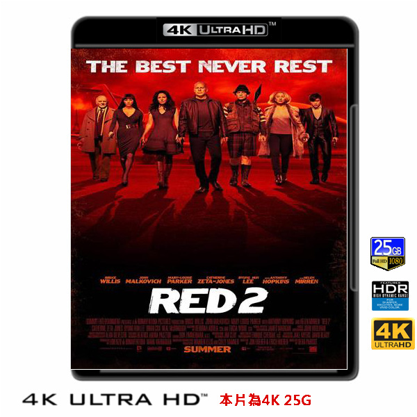商品屬性 [片名] 超危險特工2:狠戰 RED 2 (2012) 4KUHD25G [年份] 2012 [格式] 4KUHD25G50G [片裝數] 1 [發音] 英...等 [字幕] 繁中/簡中/英 [備註] 本片為4KUHD25G,藍光機無法播放,必須用4KUHD25G帶HDR的播放機來放影 本片為4KUHD - 25G本片為4KUHD影片,必須用4KUHD帶HDR播放機才可以播放,一般藍光機(Blu-ray Player, PS3, PS4, PS4 pro,Blu-ray Rom,升級後的Xbox ONE S/X 均無法讀取影片).HDR效果:必須4KUHD播放機配合電視為4K帶HDR及亮度達700NIT以上才可以完美享受HDR效果.市場上很多假4K播放機及平價假4K電視,相關規格不詳,請小心購買.有關4KUHD的問題,請參考>>>>點入參考<<<4KUHD實物包裝如圖:全美票房近億、台灣賣破6000萬票房《超危險特工》續集作品,改編自擁有蝙蝠俠與超人系列DC Comics旗下動作漫畫,由《終極警探》布魯斯威利、《變形金剛3》約翰馬可維奇、《特種部隊2:正面對決》李秉憲、《超危險特工》海倫米蘭 、《瞞天過海2: 長驅直入》凱薩琳麗塔瓊絲、《超危險特工》瑪麗露易絲派克主演。 美國情報局(CIA)前特工法蘭克(布魯斯威利飾),帶著愛侶莎拉(瑪麗露易絲派克飾)前往參加摯友馬文(約翰馬可維奇飾)的喪禮,沒想到令人措手不及的災難卻接連來襲……法蘭克被FBI拘留審訊有關25年前在莫斯科失蹤的核子武器-「夜影計畫」的相關細節,此時多名FBI卻被神秘政府探員高登暗殺,而馬克竟然出現拯救了法蘭克,法蘭克才知道,原來馬文以詐死的方式避免成為被攻擊的目標。 為了防止致命武器落入歹徒手中,法蘭克與馬文重出江湖,與昔日戰友神槍手維多莉雅(海倫米蘭飾)橫跨巴黎、倫敦和莫斯科,展開危險特工的狠戰之路,此行他們除了遇見法蘭克神秘的昔日戀人卡塔嘉(凱薩琳麗塔瓊絲飾)和科學家貝利(安東尼霍普金斯飾),他們還必須小心狙擊手-韓(李秉憲飾)的致命暗殺……
