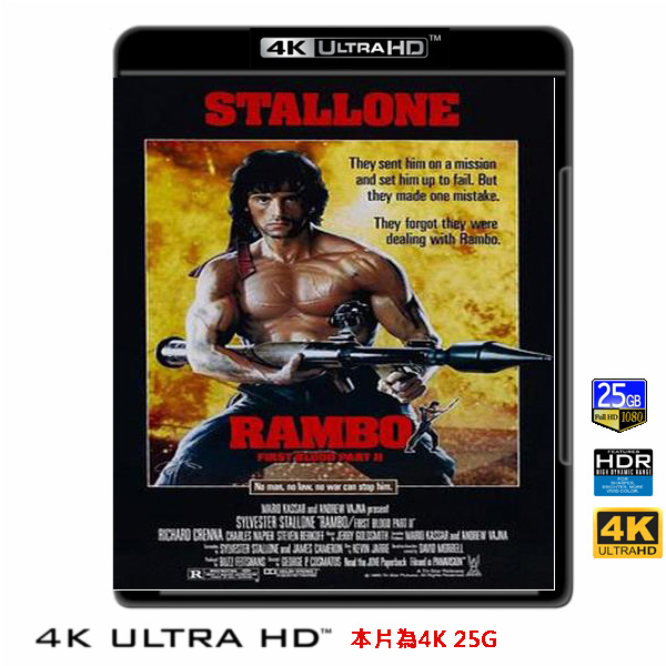 商品屬性 [片名] 第一滴血2 Rambo: First Blood Part II (1985) 4KUHD25G [年份] 1985 [格式] 4KUHD25G50G [片裝數] 1 [發音] 英...等 [字幕] 繁中/簡中/英 [備註] 本片為4KUHD25G,藍光機無法播放,必須用4KUHD25G帶HDR的播放機來放影 本片為4KUHD - 25G本片為4KUHD影片,必須用4KUHD帶HDR播放機才可以播放,一般藍光機(Blu-ray Player, PS3, PS4, PS4 pro,Blu-ray Rom,升級後的Xbox ONE S/X 均無法讀取影片).HDR效果:必須4KUHD播放機配合電視為4K帶HDR及亮度達700NIT以上才可以完美享受HDR效果.市場上很多假4K播放機及平價假4K電視,相關規格不詳,請小心購買.有關4KUHD的問題,請參考>>>>點入參考<<<4KUHD實物包裝如圖:席維斯史特龍在《第一滴血 》中扮演藍波一角大受歡迎,在續集中藍波被派返回越南調查越戰失蹤軍人下落,看看他們是否已成戰俘。沒想到當藍波到達該地後,突然失去了所有的軍備器材,只剩下一把刀及一套弓箭。 後來他發現真相,原來他被自己的部隊出賣了。在一名越南少女相助之下,藍波發揮堅強意志及高度求生技巧,克服了一切逆境,並展開了他的復仇計畫,向出賣他的人還以顏色。