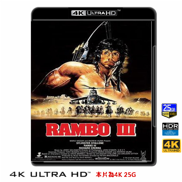 商品屬性 [片名] 第一滴血第三集 Rambo III (1988) 4KUHD25G [年份] 1988 [格式] 4KUHD25G50G [片裝數] 1 [發音] 英...等 [字幕] 繁中/簡中/英 [備註] 本片為4KUHD25G,藍光機無法播放,必須用4KUHD25G帶HDR的播放機來放影 本片為4KUHD - 25G本片為4KUHD影片,必須用4KUHD帶HDR播放機才可以播放,一般藍光機(Blu-ray Player, PS3, PS4, PS4 pro,Blu-ray Rom,升級後的Xbox ONE S/X 均無法讀取影片).HDR效果:必須4KUHD播放機配合電視為4K帶HDR及亮度達700NIT以上才可以完美享受HDR效果.市場上很多假4K播放機及平價假4K電視,相關規格不詳,請小心購買.有關4KUHD的問題,請參考>>>>點入參考<<<4KUHD實物包裝如圖:歷經無數戰火與生死考驗,孔武有力的豪情勇士約翰‧蘭博(西爾維斯特‧史泰龍 Sylvester Stallone 飾)放下手中的殺人武器,在泰國過起了平靜的修行生活。這一日,特勞特曼上校(理查德‧克里納 Richard Crenna 飾)突然出現在他面前。此前不久,上校受命率部隊前往阿富汗,協助當地的聖戰勇士反抗蘇聯人的入侵。雖然照片中阿富汗平民飽受外敵侵略和蹂躪的情景觸目驚心,但蘭博還是拒絕了上校的邀請。某晚,特勞特曼的部隊在執行任務途中遭到蘇聯軍隊的伏擊,其本人也不幸淪為階下囚。得知這一消息,蘭博再也無法靜觀其變。浴血戰士重披戰甲,隻身闖入充滿凶險的阿富汗腹地,展開一場緊張紛呈的絕命營救……