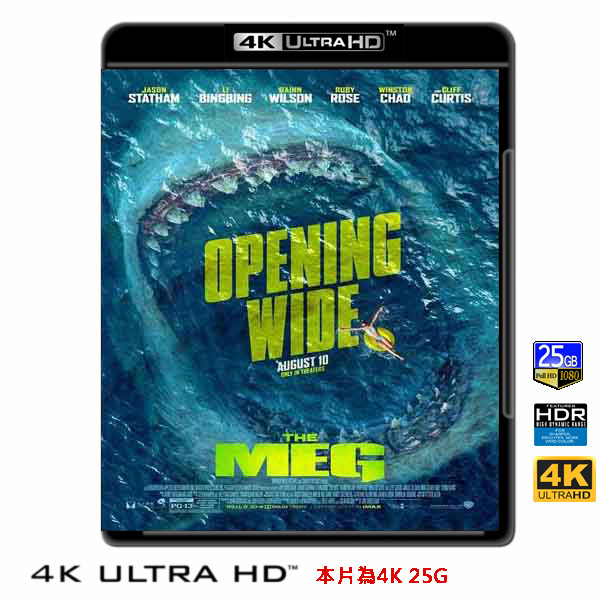 商品屬性 [片名] 巨齒鯊 The Meg (2018) 4KUHD25G [年份] 2018 [格式] 4KUHD25G50G [片裝數] 1 [發音] 英Dolby atmos 7.1/英DD5.1...等 [字幕] 繁中/簡中/英....等 [備註] 本片為4KUHD25G,藍光機無法播放,必須用4KUHD25G帶HDR的播放機來放影 本片為4KUHD - 25G本片為4KUHD影片,必須用4KUHD帶HDR播放機才可以播放,一般藍光機(Blu-ray Player, PS3, PS4, PS4 pro,Blu-ray Rom,升級後的Xbox ONE S/X 均無法讀取影片).HDR效果:必須4KUHD播放機配合電視為4K帶HDR及亮度達700NIT以上才可以完美享受HDR效果.市場上很多假4K播放機及平價假4K電視,相關規格不詳,請小心購買.有關4KUHD的問題,請參考>>>>點入參考<<<4KUHD實物包裝如圖:由《國家寶藏》系列導演強托特陶執導的動作驚悚片《巨齒鯊》,由傑森史塔森與李冰冰共同主演,讓世人深刻體會來自藍色大海深不見底的恐懼。 《巨齒鯊》敘述一艘深海探測潛艇在前往地球最深的馬里亞納海溝探測時遭到不明的巨大海底生物的攻擊,破損的船體沉入海溝中,研究人員也受困其中,眼見救援的黃金期限已經迫在眉睫,有遠見的海洋生物學家(趙文瑄 飾)緊急召募了深海救援專家喬納斯泰勒(傑森史塔森 飾),且不顧女兒(李冰冰 飾)的反對,決定與喬納斯一同深赴海底,拯救落難的潛艇人員。 然而喬納斯從咬痕一眼就斷定這是傳說中遠古海洋絕跡生物:巨齒鯊的傑作,這頭全長超過75英呎的海中巨獸,所到之處只有破壞與死亡。喬納斯知道這艘探測船已經驚動了這頭蟄伏以久的海中巨獸,牠已經在一旁環伺,等待獵物一步步靠近。喬納斯人生中第二次感到如此強烈的恐懼;因為數年前他也曾經與這頭巨獸交手過,勉強逃生,並且在他的人生中留下不可抹滅的陰影。但這次為了拯救這片海洋與在深海中的夥伴,他必須挺身而出,再一次面對生命中最大的恐懼…與這頭史上最巨大、強悍的掠食動物。
