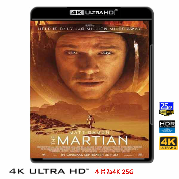 商品屬性 [片名] 絕地救援 The Martian (2015) 4KUHD25G [年份] 2015 [格式] 4KUHD25G50G [片裝數] 1 [發音] 英 DTS 7.1/英DD5.1...等 [字幕] 繁中/簡中/英....等 [備註] 本片為4KUHD25G,藍光機無法播放,必須用4KUHD25G帶HDR的播放機來放影 本片為4KUHD - 25G本片為4KUHD影片,必須用4KUHD帶HDR播放機才可以播放,一般藍光機(Blu-ray Player, PS3, PS4, PS4 pro,Blu-ray Rom,升級後的Xbox ONE S/X 均無法讀取影片).HDR效果:必須4KUHD播放機配合電視為4K帶HDR及亮度達700NIT以上才可以完美享受HDR效果.市場上很多假4K播放機及平價假4K電視,相關規格不詳,請小心購買.有關4KUHD的問題,請參考>>>>點入參考<<<4KUHD實物包裝如圖:《異形》《普羅米修斯》導演雷利史考特最新科幻作品,麥特戴蒙主演。劇本取材自Andy Weir所撰寫的暢銷網路小說〈火星任務〉,描述一名太空人因故擱淺在火星上,試圖努力存活下來並找出返回地球的路徑,情節也被形容為像是結合《浩劫重生》與《阿波羅13》的太空求生故事。 太空人馬克瓦特尼(麥特戴蒙飾)和太空小組首次登陸火星執行任務時,意外遭受強烈的暴風侵襲,一行人被迫放棄任務即刻撤退,馬克卻遭暴風中的物體高速擊中,並與成員分散,組員們誤以為他已不幸殉職便直接折返地球。清醒後的馬克,發現自己孤伶伶的受困在火星上,他必須運用有限的資源和他擁有的知識努力存活下來,並設法傳送訊息,告訴地球上的組員們他還活著。而地球上的團隊又將如何突破重重困難,並在分秒必爭的限制下重返火星救回馬克?
