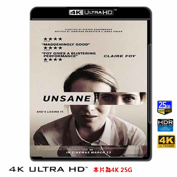 商品屬性 [片名] 瘋人院 Unsane (2018) 4KUHD25G [年份] 2018 [格式] 4KUHD25G50G [片裝數] 1 [發音] 英 [字幕] 繁中/簡中/英 [備註] 本片為4KUHD25G,藍光機無法播放,必須用4KUHD25G帶HDR的播放機來放影 本片為4KUHD - 25G本片為4KUHD影片,必須用4KUHD帶HDR播放機才可以播放,一般藍光機(Blu-ray Player, PS3, PS4, PS4 pro,Blu-ray Rom,升級後的Xbox ONE S/X 均無法讀取影片).HDR效果:必須4KUHD播放機配合電視為4K帶HDR及亮度達700NIT以上才可以完美享受HDR效果.市場上很多假4K播放機及平價假4K電視,相關規格不詳,請小心購買.有關4KUHD的問題,請參考>>>>點入參考<<<4KUHD實物包裝如圖:金獎導演史蒂芬索德柏最新恐怖鉅作,全程以IPHONE拍攝完成。 驚悚度直逼《逃出絕命鎮》 曲折離奇劇情猶如《隔離島》。 挑戰人對群體社會的價值信仰,這世界上有什麼是真是假,你信得過自己嗎? 克萊兒芙伊主演。 一名年輕的女子為了逃離自己過去混沌的生活,她選擇遠離家鄉展開全新的人生,以為嶄新的生活可以讓她調整好自己的腳步,但未料她卻遭受到突如其來被強制送進精神療養院,她將面對自己最大的內心恐懼。究竟這一切是真實存在?還是全都是幻覺作祟?這個世界上沒有一個人相信她,也沒有任何一個機構能夠或願意伸出援手,她將獨自承擔所有的壓力,與世界為敵。 《瘋人院》透過不同的觀點,結合驚人的故事情節,要對人們對現實生活的感知、生存本能,及所謂的社會互助結構提出最嚴苛的質問!