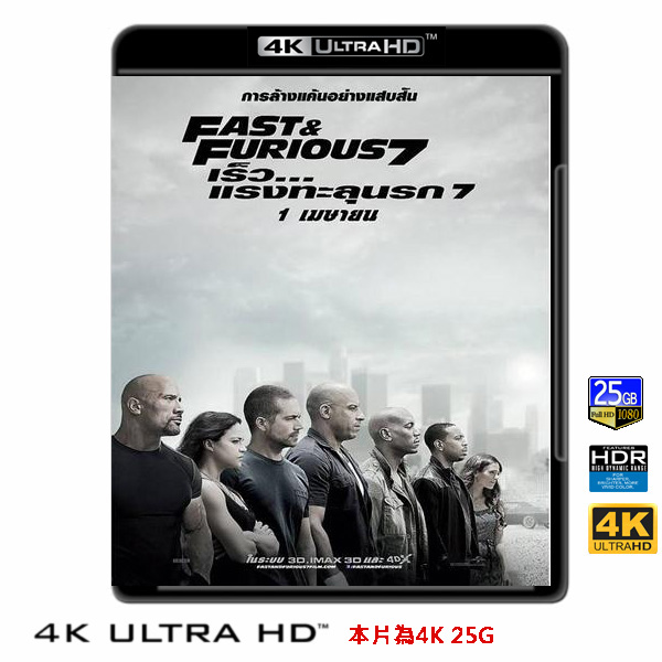 商品屬性 [片名] 玩命關頭7 Furious 7 (2014) 4KUHD25G [年份] 2014 [格式] 4KUHD25G50G [片裝數] 1 [發音] 英 [字幕] 繁中/簡中/英 [備註] 本片為4KUHD25G,藍光機無法播放,必須用4KUHD25G帶HDR的播放機來放影 本片為4KUHD - 25G本片為4KUHD影片,必須用4KUHD帶HDR播放機才可以播放,一般藍光機(Blu-ray Player, PS3, PS4, PS4 pro,Blu-ray Rom,升級後的Xbox ONE S/X 均無法讀取影片).HDR效果:必須4KUHD播放機配合電視為4K帶HDR及亮度達700NIT以上才可以完美享受HDR效果.市場上很多假4K播放機及平價假4K電視,相關規格不詳,請小心購買.有關4KUHD的問題,請參考>>>>點入參考<<<4KUHD實物包裝如圖:《玩命關頭7》由導演詹姆斯.溫(溫子仁)執導,馮迪索擔任製片,耗資2.5億美金,將由馮迪索、保羅沃克、以及巨石強森以終極狂飆速度帶領所有演員回歸!新加入的角色包括傑森史塔森、吉蒙翰蘇、東尼嘉、龍達魯西和寇特羅素。全球總票房飆破10億美元。故事發生在唐老大(馮迪索)和布萊恩(保羅沃克)重獲自由一年多後,他們擺脫暗無天日的亡命生活,卻發現這個家脫離現實。唐老大忙著和莉蒂(蜜雪兒羅卓奎茲 飾)重新培養感情,布萊恩則努力跟蜜雅(喬丹娜布魯斯特 飾)和兒子適應郊區生活,泰吉(路達克里斯 飾)和羅曼(泰瑞斯喬布森)倒是實現花花公子的夢想,大肆慶祝得來不易的自由。可怕的是,他們都沒發現危機伺伏。英國特種部隊殺手戴克蕭(傑森史塔森 飾),正準備為弟弟歐文蕭(路克伊凡斯 飾)報仇。東京的韓哥(姜成 飾)先遭到謀殺,洛杉磯的哈柏(巨石強森 飾)緊接遭暗算。戴克蕭炸了唐老大的家。那個家是玩命團隊重獲自由後,全家人所重返的避風港。在面對戴克蕭的獵殺下,唐需要奪回主動權,此時,美國政府的神秘特務(寇特羅素 飾)提出一項任務,讓彼此之間都能取得共同利益。這些英雄們打算重操舊業,為美國政府奪回天眼系統,此裝置可以幫他們找到戴克蕭的下落,以免家人再度遭到毒手。玩命團隊再度出擊,有唐老大、布萊恩、哈柏、莉蒂、羅曼、泰吉,他們在片中面臨前所未見的威脅,並遠征阿布達比和亞塞拜然,當然還有他們最熟悉的—洛杉磯街頭。「玩命關頭」系列後來跨出美國,玩命團隊的足跡在日本、墨西哥、多明尼加、巴西、加納利群島和英國後,到了《玩命關頭7》,重返東京後又轉往阿布達比。片中空中飛車跳機,動員空中攝影師、降落傘配備、安全帽式攝影機、直升機等,成為一大賣點。片中這次使用超高貴的跑車是Lykan HyperSport定價340萬美元(台幣達1億700萬元),全球僅有7台,採幾何切割風格,線條強壯,0-200km/h加速9.4秒、極速385km/h。 其他出場的跑車還有Chevrolet Camaro Z/28、Subaru Impreza WRX 、Dodge Challenger SRT8 392、1970 Plymouth Barracuda等。首映以來在美國和加拿大共撈2億9400萬美元,連續3周稱霸北美票房冠軍,《玩命關頭》系列7部電影已破影史紀錄,共海撈33億9000萬美元。