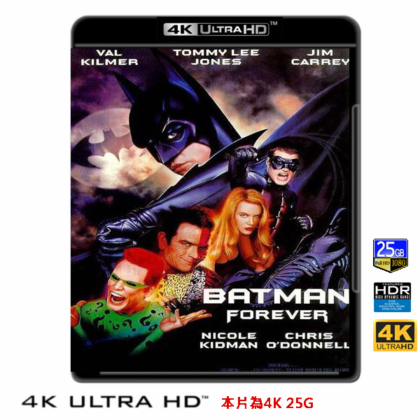 商品屬性 [片名] 蝙蝠俠3 Batman Forever (1995) 4KUHD25G [年份] 1995 [格式] 4KUHD25G50G [片裝數] 1 [發音] 英 [字幕] 繁中/簡中/英 [備註] 本片為4KUHD25G,藍光機無法播放,必須用4KUHD25G帶HDR的播放機來放影 本片為4KUHD - 25G本片為4KUHD影片,必須用4KUHD帶HDR播放機才可以播放,一般藍光機(Blu-ray Player, PS3, PS4, PS4 pro,Blu-ray Rom,升級後的Xbox ONE S/X 均無法讀取影片).HDR效果:必須4KUHD播放機配合電視為4K帶HDR及亮度達700NIT以上才可以完美享受HDR效果.市場上很多假4K播放機及平價假4K電視,相關規格不詳,請小心購買.有關4KUHD的問題,請參考>>>>點入參考<<<4KUHD實物包裝如圖:蝙蝠俠再度駕著他的蝙蝠車和最佳拍檔羅賓,智鬥高譚市兩大犯罪天才,難纏的「雙面人」和「迷天大聖」又愛上了美麗的心理博士馬慈絲,撲朔迷離的愛情、聰明的犯罪高手,困擾著蝙蝠俠......