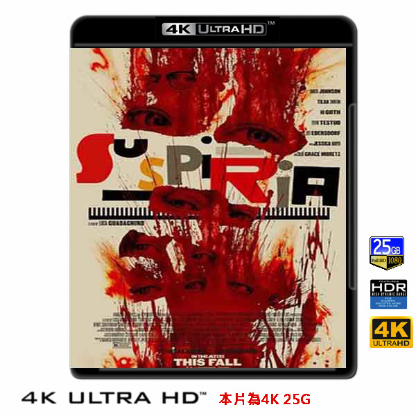 商品屬性 [片名] 窒息 Suspiria (2018) 4KUHD25G [年份] 2018 [格式] 4KUHD25G50G [片裝數] 1 [發音] 英 [字幕] 繁中/簡中/英 [備註] 本片為4KUHD25G,藍光機無法播放,必須用4KUHD25G帶HDR的播放機來放影 本片為4KUHD - 25G本片為4KUHD影片,必須用4KUHD帶HDR播放機才可以播放,一般藍光機(Blu-ray Player, PS3, PS4, PS4 pro,Blu-ray Rom,升級後的Xbox ONE S/X 均無法讀取影片).HDR效果:必須4KUHD播放機配合電視為4K帶HDR及亮度達700NIT以上才可以完美享受HDR效果.市場上很多假4K播放機及平價假4K電視,相關規格不詳,請小心購買.有關4KUHD的問題,請參考>>>>點入參考<<<4KUHD實物包裝如圖:英國衛報「影史十大恐怖片」全新翻拍。克蘿伊摩蕾茲、達柯塔強生、蒂妲絲雲頓、米亞高絲主演。 故事講述由達柯塔強生飾演的年輕舞者蘇西終於來到夢寐以求的舞蹈學院,隨著一連串謀殺事件和靈異現象潛伏於學校暗處,她也將發現指導老師白夫人常掛在嘴邊的那句「把靈魂奉獻給舞蹈」也許並不是表面上所想的這麼簡單! 滿懷志向的舞蹈新秀蘇西(達柯塔強生 飾)進入柏林頂尖舞蹈學校─馬可斯舞蹈學院,沒想到住校第一天就目睹謀殺慘案!伴隨著全校詭譎氛圍,蘇西仍拚盡全力在學院嚴格訓練自己,藝術總監白夫人(蒂妲史雲頓 飾)對她的表現非常青睞,想將她培養成下一個明日之星。但隨著蘇西一步步取代舞團首席,她也漸漸發現學校深處的腥風血雨,一連串可怕的謀殺事件和靈異現象不斷發生,越來越害怕的蘇西,即將揭開芭蕾舞蹈名校毛骨悚然的黑暗歷史。